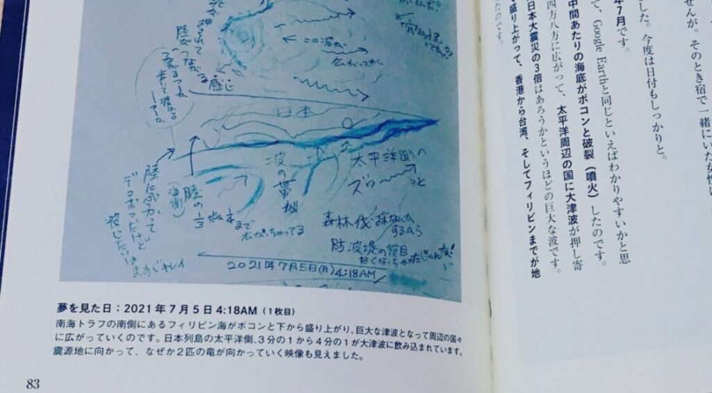 たつき氏は「日本とフィリピンの中間あたりの海底が破裂し、南海トラフ地震の想定を超える壊滅的な大津波が日本の太平洋側を襲う」という衝撃的な夢を見たと記述。