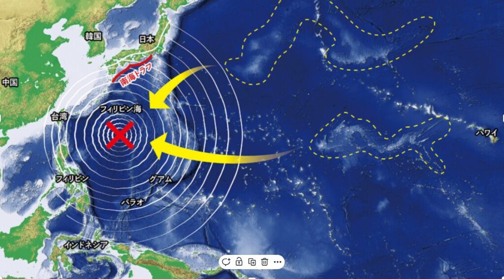 たつき諒氏の漫画『私が見た未来 完全版』に基づく「7月5日予言」では、震源地として「日本とフィリピンの中間あたりの海底」が明記されています。